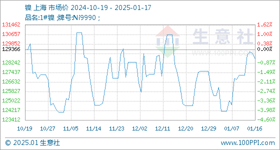 1月17日,生意社镍基准价为128608.33元/吨,与本月初(125475.00元/吨)相比,上涨了2.50%。