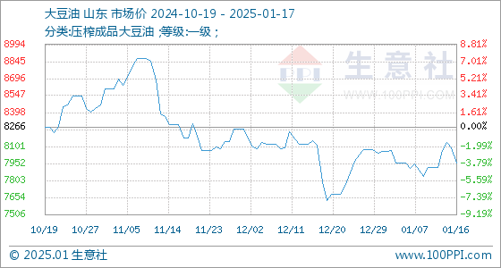 1月17日,生意社大豆油基准价为7956.00元/吨,与本月初(8056.00元/吨)相比,下降了-1.24%。