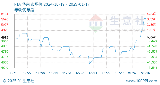 1月17日,生意社PTA基准价为5084.44元/吨,与本月初(4790.00元/吨)相比,上涨了6.15%。