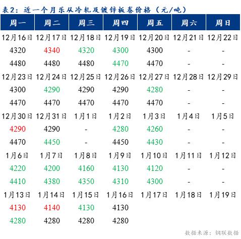 截止2025年1月16日17:30,冷轧板卷月均价为4240元/吨,镀锌板卷月均价为4409元/吨。