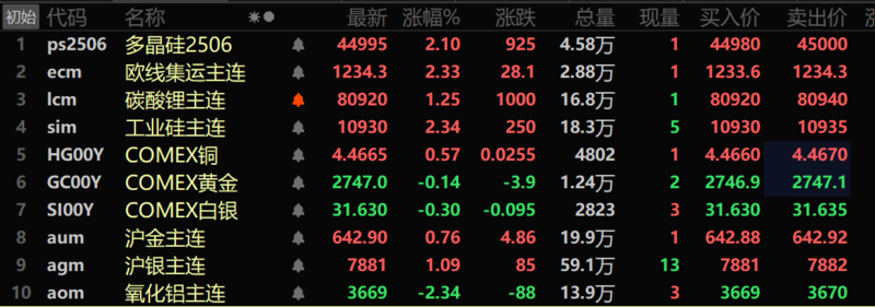 此外,氧化铝延续前十一个交易日的跌势继续跌2.34%。碳酸锂涨1.25%,工业硅涨2.34%。多晶硅主力期货涨2.1%。