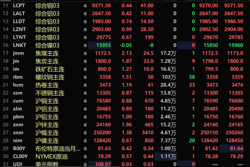 黑色系均飘红,铁矿涨1.27%,螺纹、热卷分别涨1.51%、1.19%,不锈钢涨0.87%。双焦方面,焦煤涨2.13%,焦炭涨1.87%。