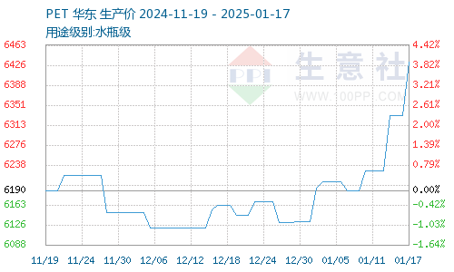 根据生意社商品行情分析系统,截至1月17日的数据显示,PET的平均销售价格为6432元/吨,价格走势呈现出强势上行的趋势。