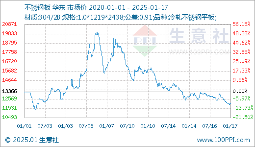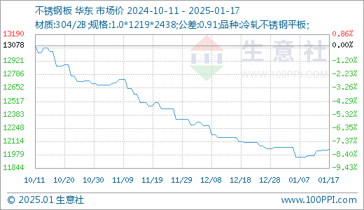 据生意社价格监测,本周不锈钢价格小幅上涨。截止1月17日,现货304/2B不锈钢平板1.0*1219*2438(公差0.91)的日均价为现报价12035.71元/吨,较周初上涨0.12%,同比下跌6.6%。