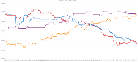 从库存端来看,截至2025年1月16日,国内纯碱厂家总库存143.11万吨,较周一减少1,16万吨,跌幅0.80%。其中,轻质纯碱58.77万吨,环比下跌2.48万吨,重质纯碱84.34万吨,环比增加1.32万吨。纯碱出库良好缓解了行业库存压力;玻璃库存累库压力同样不高,最新全国浮法玻璃样本企业总库存4385.3万重箱,环比增加15.1万重箱,环比提升0.35%,折库存天数20.5天,较上期提高0.2天。华北地区整体出货较好,主要受中下游及期现企业备货支撑,产销率基本维持在平衡附近,整体库存延续下降趋势,尤其沙河企业库存极低,部分企业基本零库存;华中市场本周企业出货不一,湖北部分企业受中游环节适里备货支撑,库存下滑明显,其余地区出货一般。