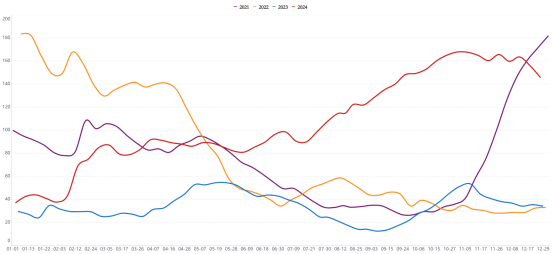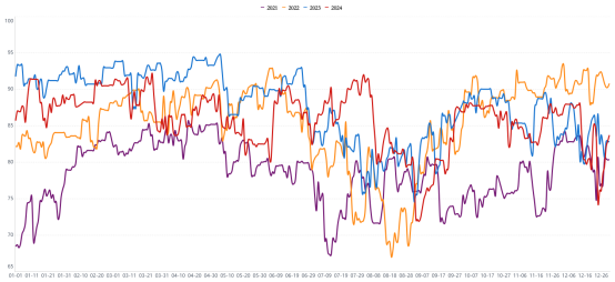 从供应端来看,纯碱本周检修企业逐步恢复,整体开工及产量提升,本周纯碱产能利用率86.57%,环比提高4.21%;产量71.44万吨,环比上升4.04%。然而纯碱期货期货价格依然延续上涨,空头可能存在以下担忧:尽管本周产量有所增加,但市场可能对未来的供应存在担忧。例如,部分企业可能面临后续的检修计划,或者受到环保政策、原材料供应等因素的影响,导致未来的供应存在不确定性。此外,春节将至,运输环节问题可能影响纯碱的实际供应,运输成本上升、运输效率降低或者物流配送出现延迟,可能导致市场上可交易的纯碱数量下降,而部分企业也选择年底备货,市场短期出现了需求相对回升的状况,从而推动期货价格上涨。玻璃作为纯碱主要下游消费领域,行业平均开工率本周虽环比下降0.62%,但整体仍维持在一定水平,对纯碱的需求依然稳定。且随着光伏产业的发展,光伏玻璃对纯碱的需求持续增加,支撑了纯碱期货价格。