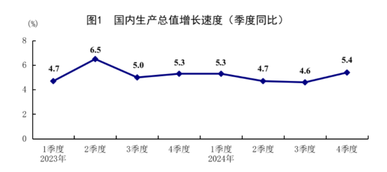 今日,国新办召开新闻发布会介绍2024年国民经济运行情况,根据国家统计局数据,初步核算,全年国内生产总值1349084亿元,按不变价格计算,比上年增长5.0%。分产业看,第一产业增加值91414亿元,比上年增长3.5%;第二产业增加值492087亿元,增长5.3%;第三产业增加值765583亿元,增长5.0%。分季度看,一季度国内生产总值同比增长5.3%,二季度增长4.7%,三季度增长4.6%,四季度增长5.4%。从环比看,四季度国内生产总值增长1.6%。从最新数据看,中国经济增长总体态势良好、各产业发展亮点突出、需求与消费结构持续优化、就业与物价形势总体稳定,对商品市场信心产生了一定的提振。