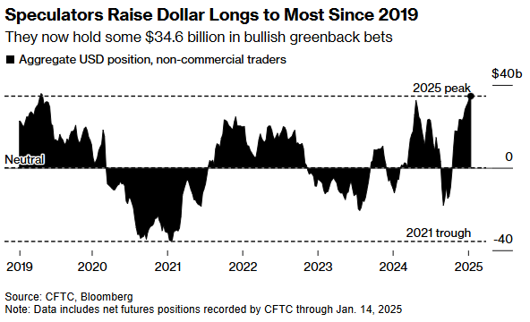 唐纳德.特朗普重返白宫的脚步正在逼近。根据美国商品期货交易委员会(CFTC)周五公布的数据和媒体(Bloomberg)汇总的数据,截至1月14日,衍生品交易员持有的押注总额约为346亿美元,这些押注将从美元的进一步走强中受益,比上周增加了近10亿美元,是自2019年以来的最高水平。