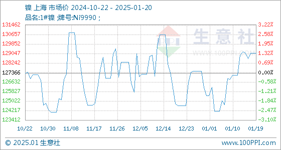 1月20日,生意社镍基准价为129075.00元/吨,与本月初(125475.00元/吨)相比,上涨了2.87%。