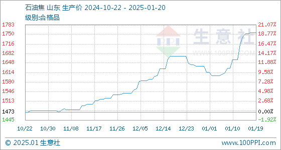 1月20日,生意社石油焦基准价为1755.75元/吨,与本月初(1615.00元/吨)相比,上涨了8.72%。