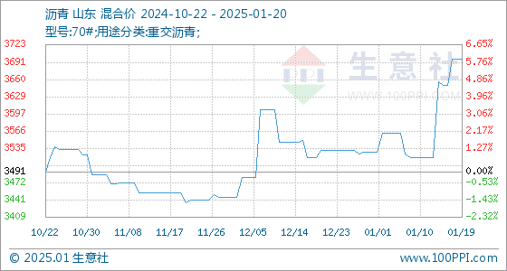 1月20日,生意社沥青基准价为3697.20元/吨,与本月初(3528.00元/吨)相比,上涨了4.80%。