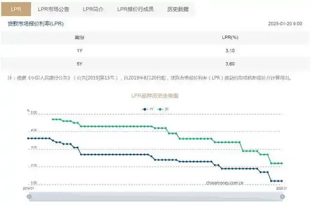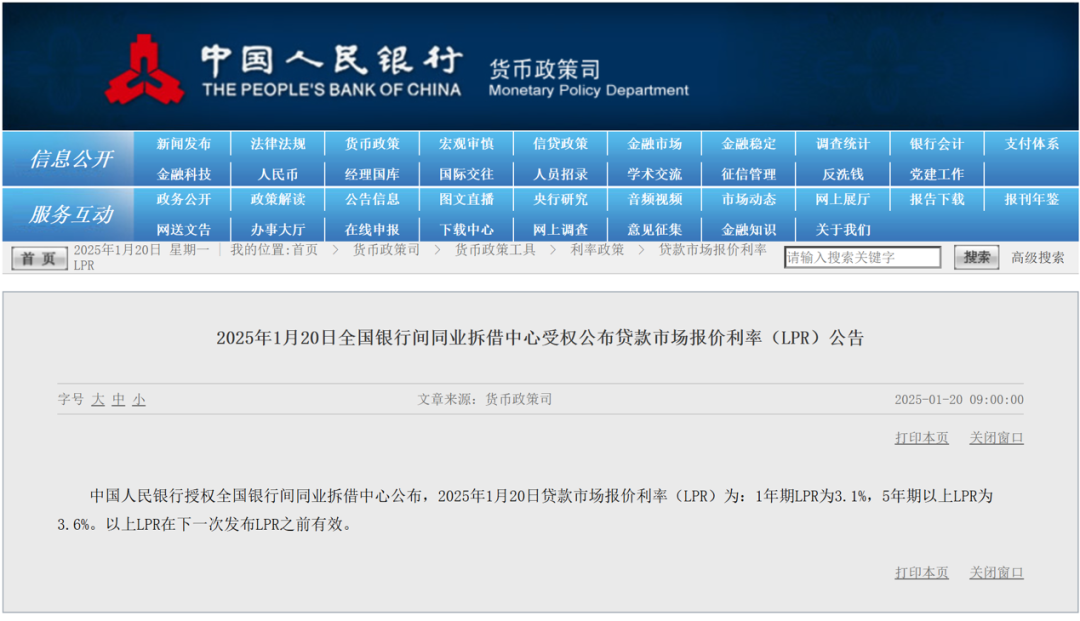 根据央行网站消息,2025年1月LPR按兵不动:1年期为3.1%,5年期以上为3.6%。