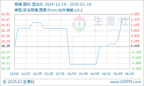 据生意社商品分析系统显示,下游玻璃行情强势运行。1月13至19日,玻璃价格从16.25元/平方米涨至16.48元/平方米,涨幅1.42%。下旬玻璃市场开工率变动不大,下游入市积极性较好,厂家出货较顺畅,市场去库增加,玻璃价格偏强上行。