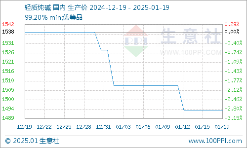 据生意社商品分析系统显示,本周纯碱价格平稳运行调,截至1月19日纯碱市场均价在1494元/吨,与1月13日纯碱价格1494元/吨相比持平,环比上月跌幅2.86%。