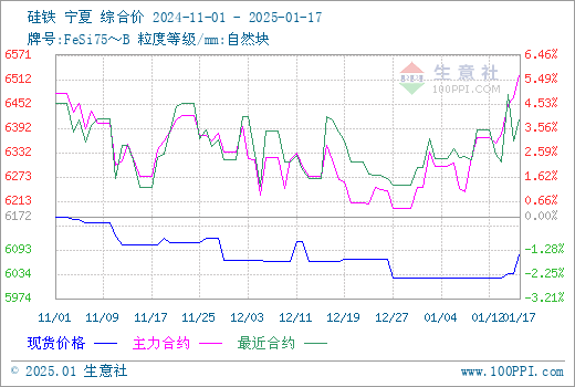 自河钢招标定价敲定后,市场方向得以明朗后,本周归来,其他钢厂以此为参考陆续进行新一轮硅铁招标采购,各大钢厂招标缓慢推进,再加之电价、运输费用等原料价格传出上调消息,成本端仍有一定支撑及部分地区工厂库存压力不大,期货行情震荡上行对现货市场形成有利支撑,近期硅铁现货价格上调50元/吨左右。据生意社商品行情分析系统,1月17日硅铁(牌号:FeSi75~B;粒度等级/mm:自然块)宁夏地区市场报价在6000-6100元/吨,市场均价6081元/吨,涨0.92%。