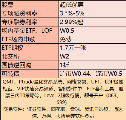 上市大券商提供超低股票交易佣金,场内基金和可转债交易费率可低至十万分之五。国债逆回购享有一折优惠,专项融资融券利率4%—5%(量大可进一步协商),期权交易每张仅需1.7元全包。