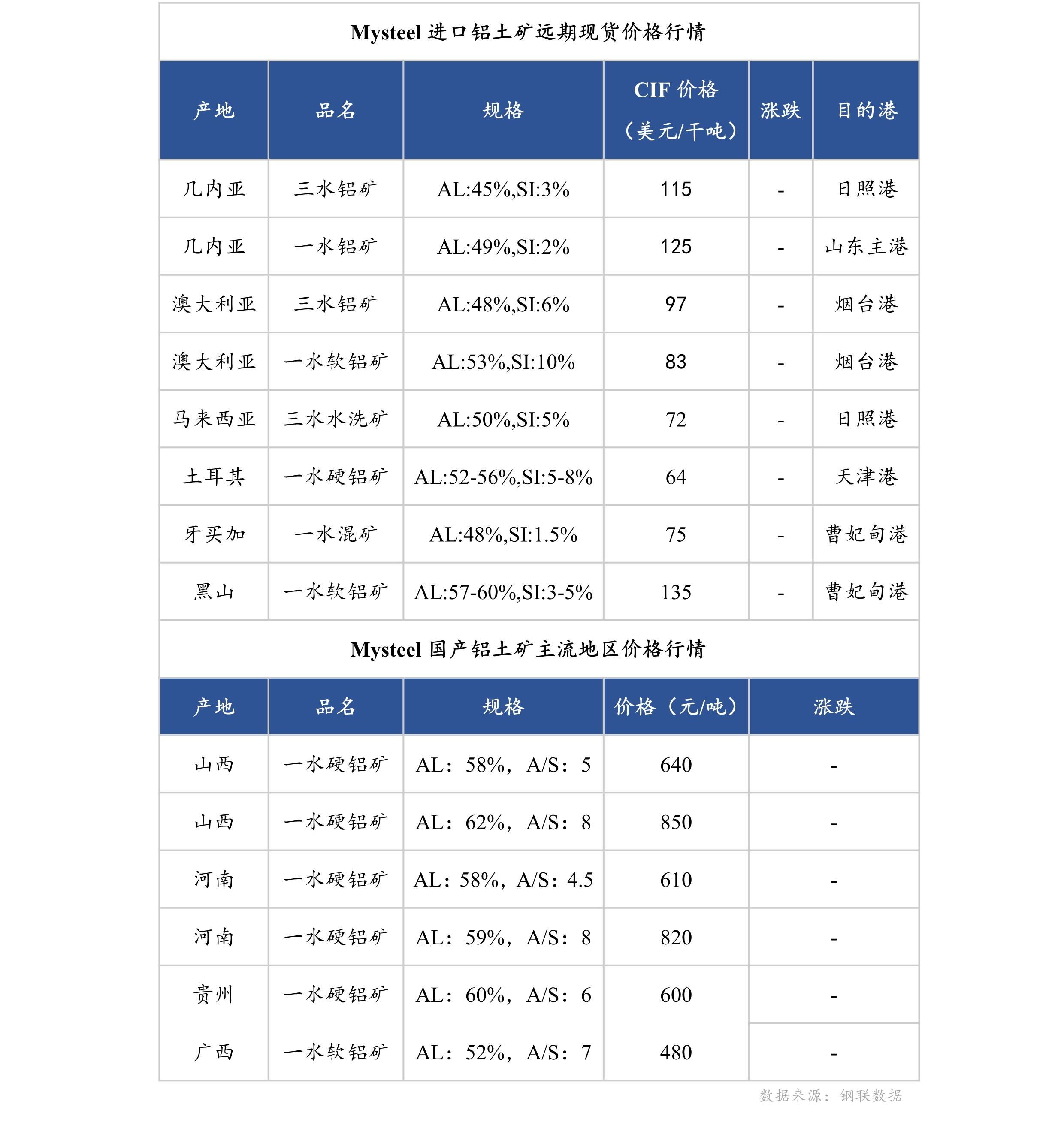1月20日国产铝土矿价格平稳运行。国产矿山维持常态开工,临近春节,大多矿企会选择清仓过节,供应较往常好转,需求端压价采购意愿明显,矿石价格承压僵持运行。