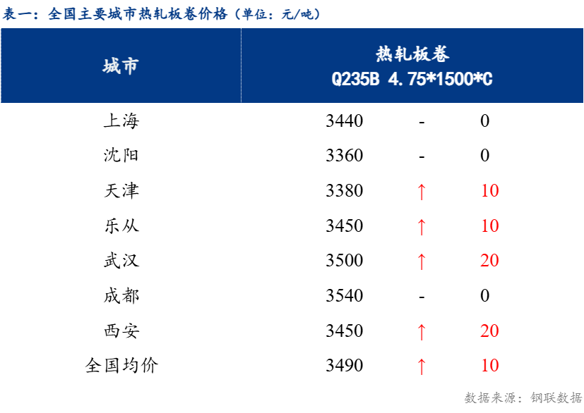 截止发稿时4.75热轧板卷全国均价3490元/吨,较上一交易日上涨11元/吨。其中主要城市价格为上海3440元/吨,沈阳3360元/吨,天津3380元/吨,乐从3450元/吨,武汉3500元/吨,成都3540元/吨,西安3450元/吨。