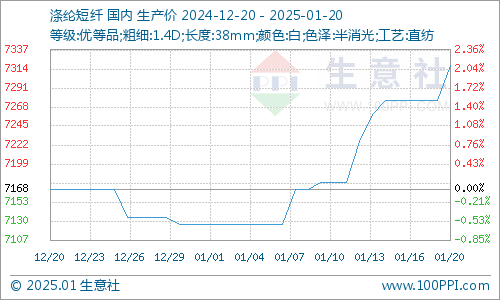 近期,国内涤纶短纤装置减产及检修增多,行业开工负荷率走势明显下滑,货源供应量减少,对价格形成利好驱动。据生意社商品行情分析系统,截止1月20日江浙地区1.4D*38mm出厂均价在7318元/吨,较月初上涨2.69%。