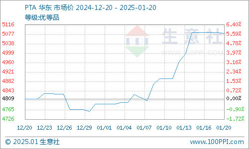 PTA现货市场行情跟涨原油,且华南一套125万吨PTA装置停车检修,另外主力供应商官宣多套PTA装置检修计划也提振PTA行情。截止1月20日华东地区PTA市场价格为5081元/吨,较月初上涨6.08%。