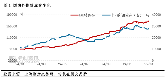 由于国内精炼镍春节期间对开工无明显影响,国产电积镍外流后节前伦镍库存出现明显增加趋势。春节假期期间,国内终端下游市场消耗能力继续减弱,期镍库存会有较大增长可能,这对节后镍价会形成压力。如图1所示,整个2024年期镍库存增加明显,这也是镍价下跌的关键影响因素之一。