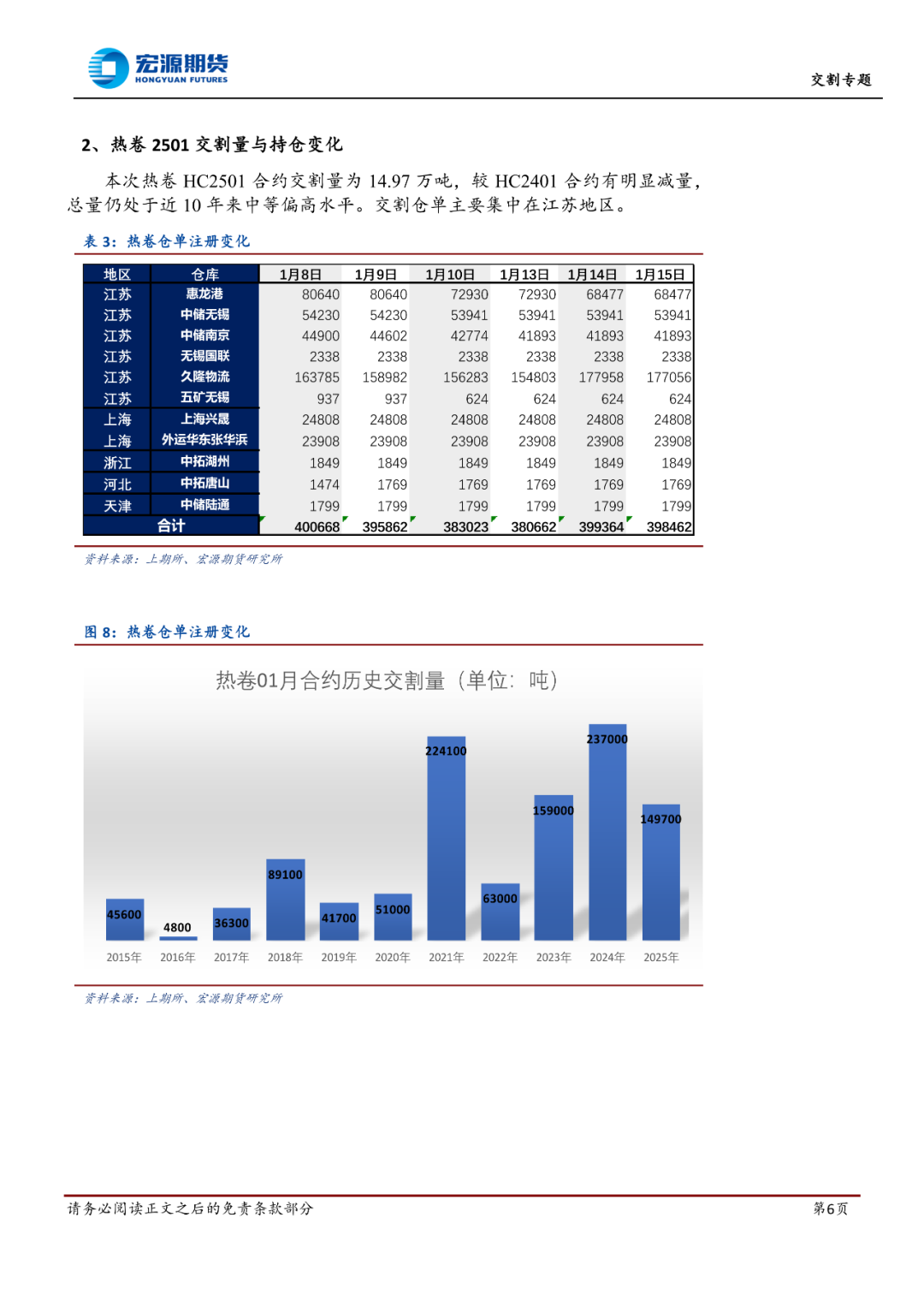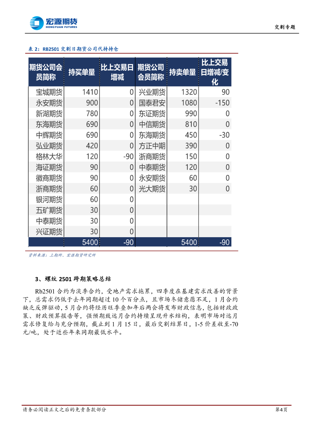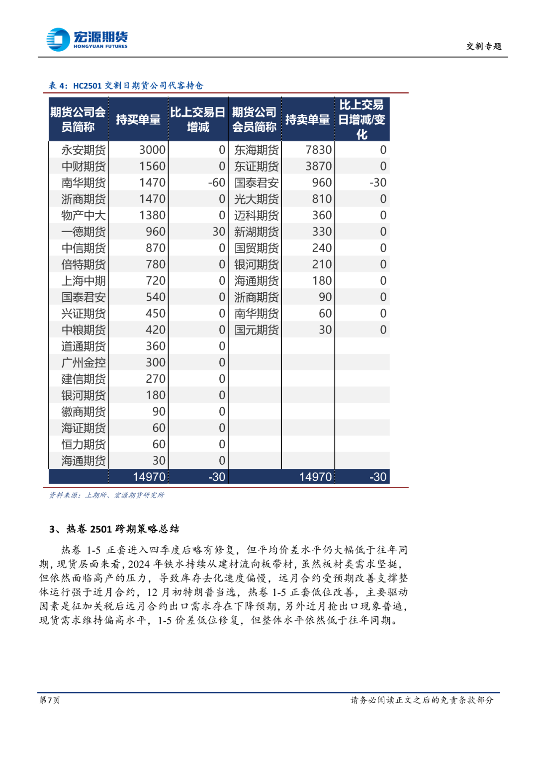 本次热卷 2501 合约交割结算价为 3380 元/吨,较上海热卷现货价格贴水 30 元/吨,较天津热卷现货价格贴水 40 元/吨,处于历史中等水平。从卖方席位来看,本次交割相对买方集中,由于盘面存在阶段性升水结构,叠加产量持续高位,导致去库速度偏慢,产业客户套保需求增加,其中生产企业交割为主导力量。