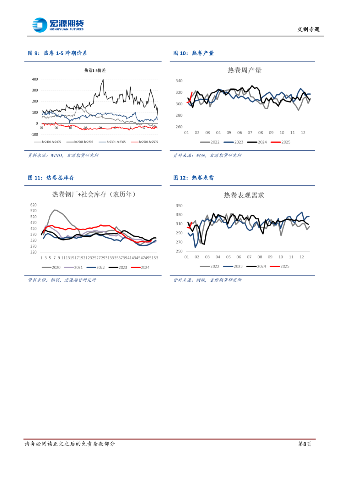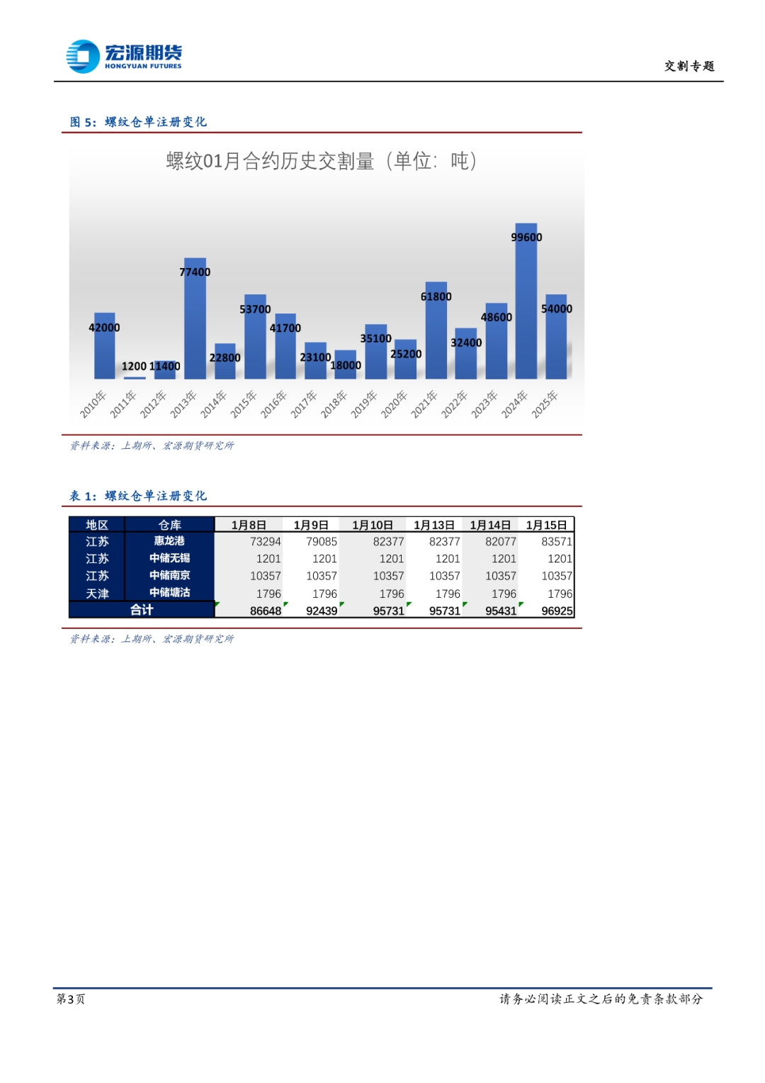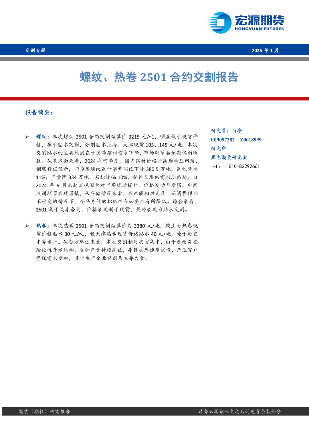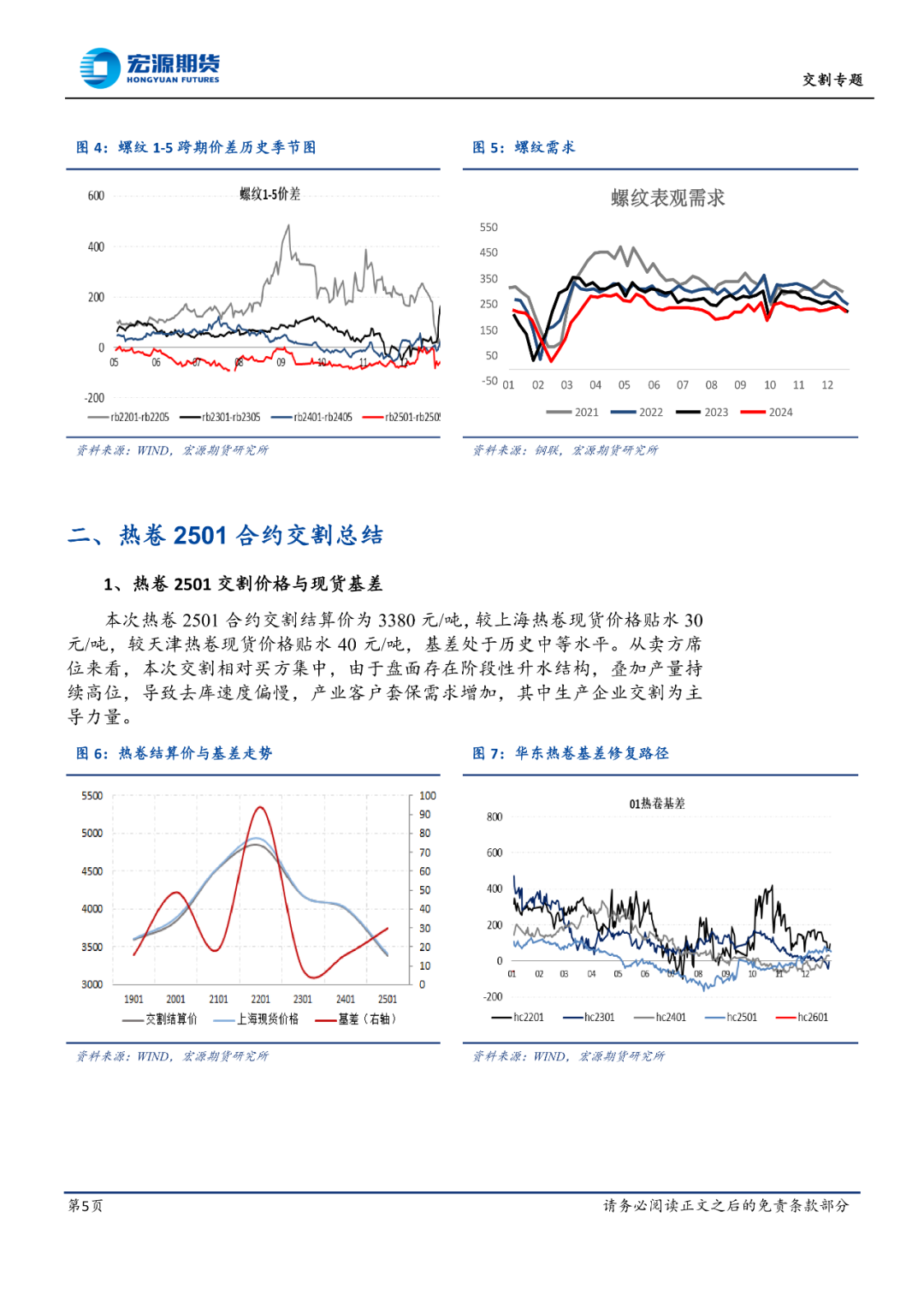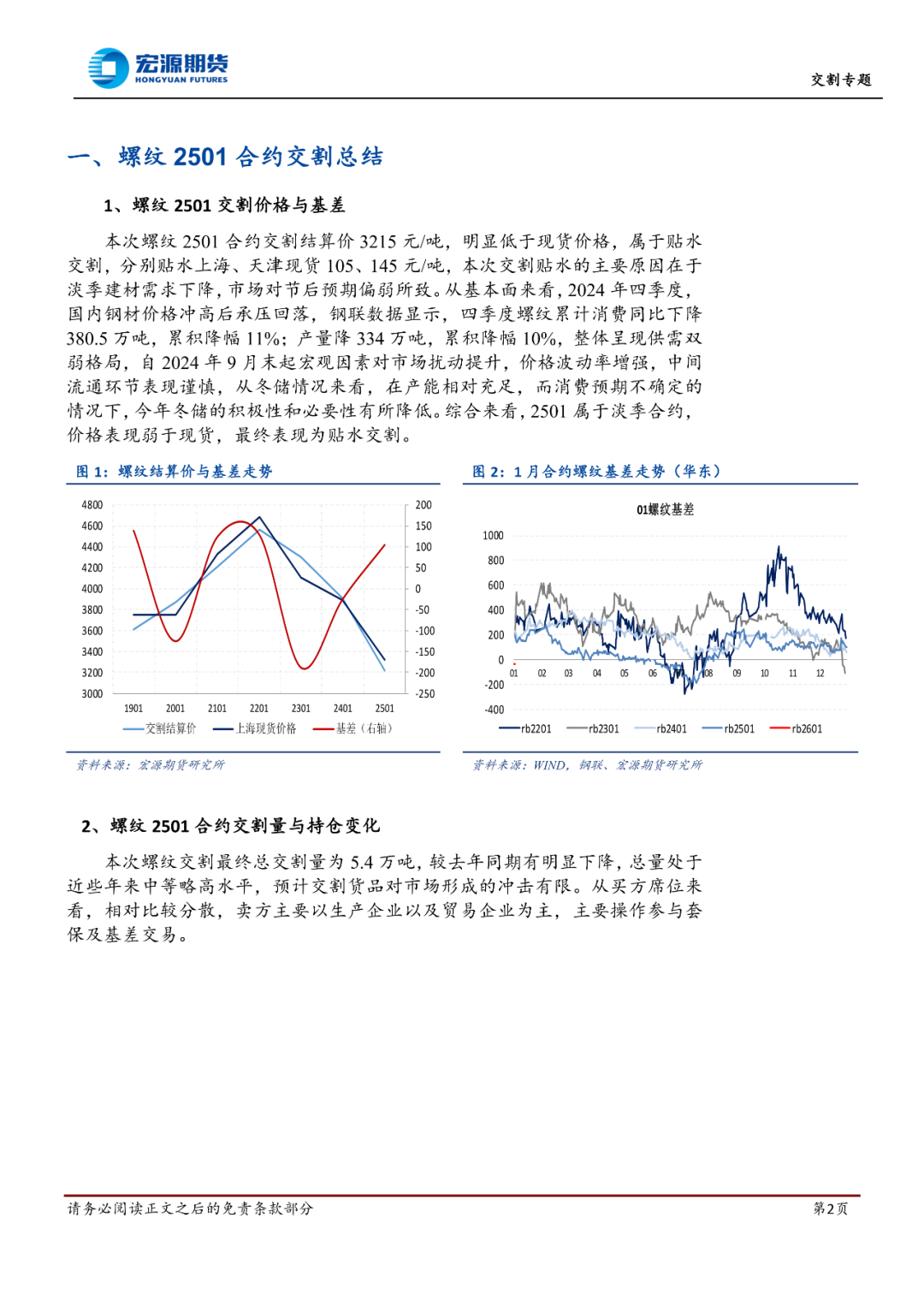 本次螺纹 2501 合约交割结算价 3215 元/吨,明显低于现货价格,属于贴水交割,分别贴水上海、天津现货 105、145 元/吨,本次交割贴水的主要原因在于淡季建材需求下降,市场对节后预期偏弱所致。从基本面来看,2024 年四季度,国内钢材价格冲高后承压回落,钢联数据显示,四季度螺纹累计消费同比下降 380.5 万吨,累积降幅11%;产量降 334 万吨,累积降幅 10%,整体呈现供需双弱格局,自2024 年 9 月末起宏观因素对市场扰动提升,价格波动率增强,中间流通环节表现谨慎,从冬储情况来看,在产能相对充足,而消费预期不确定的情况下,今年冬储的积极性和必要性有所降低。综合来看,2501 属于淡季合约,价格表现弱于现货,最终表现为贴水交割。