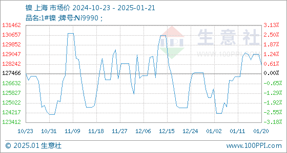 1月21日,生意社镍基准价为128183.33元/吨,与本月初(125475.00元/吨)相比,上涨了2.16%。