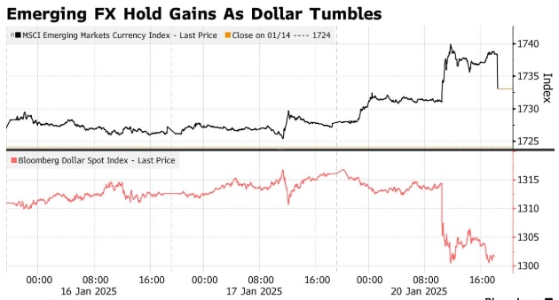 随着特朗普在宣誓就职时没有宣布新的贸易关税,追踪新兴市场货币的一项指标周一也上涨。MSCI新兴市场货币指数盘中攀升0.7%,但尾盘调整后仅上涨0.3%,创下去年9月以来最佳表现。匈牙利福林和波兰兹罗提领先。投资者认为受美国关税影响较大的加元、人民币和墨西哥比索分别上涨了至少1%。新兴市场股市也上涨,MSCI新兴市场股指上涨1.2%。