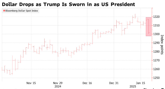 智通财经获悉,在特朗普宣誓就任美国总统之际,此前媒体报道特朗普上任第一天不会征收新关税后,美元下跌,周一,媒体美元现货指数下跌1.1%,创14个月来最大跌幅,美国其他金融市场因假期休市。美元走软帮助提振了其他外币汇率,推动欧元兑美元汇率上涨1.6%,至1.0434。