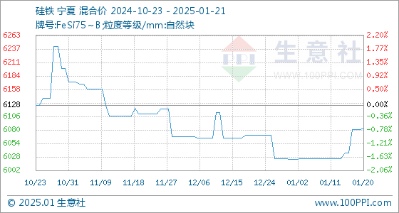 1月21日,生意社硅铁基准价为6082.86元/吨,与本月初(6024.29元/吨)相比,上涨了0.97%。