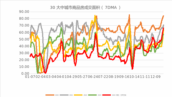 2024年以来房地产市场仍然面临压力,从1-11月份投资、销售、新开工、施工等数据来看,依然处在深度负增长中,修复不及预期,筑底周期延长。与2021年行业顶峰相比,销售面积下降30%,回到2015年。房屋新开工面积较2019年高峰下降近六成,为2013年以来新低。开发投资规模连续两年下降到接近2018年的水平。受人口负增长和老龄化的影响,从较长时间周期来看,房屋总需求下降。而受居民收入预期下滑以及信心恢复不够影响,中短期居民购房意愿及购房能力下降。