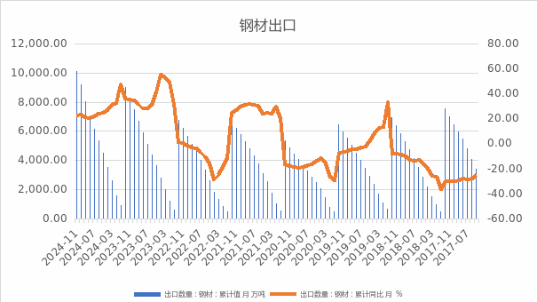 2024年钢材出口继续维持高位,1-11月我国出口钢材10115.2万吨,同比增长22.6%。在上年基数偏低的情况下,12月份钢材出口同比仍有望维持增长态势,全年钢材出口有望达到1.1亿吨。参考历史数据,2015年钢材出口历史最高达到1.12亿吨,预计2024年钢材出口量略低于2015年,位居历史次高水平。