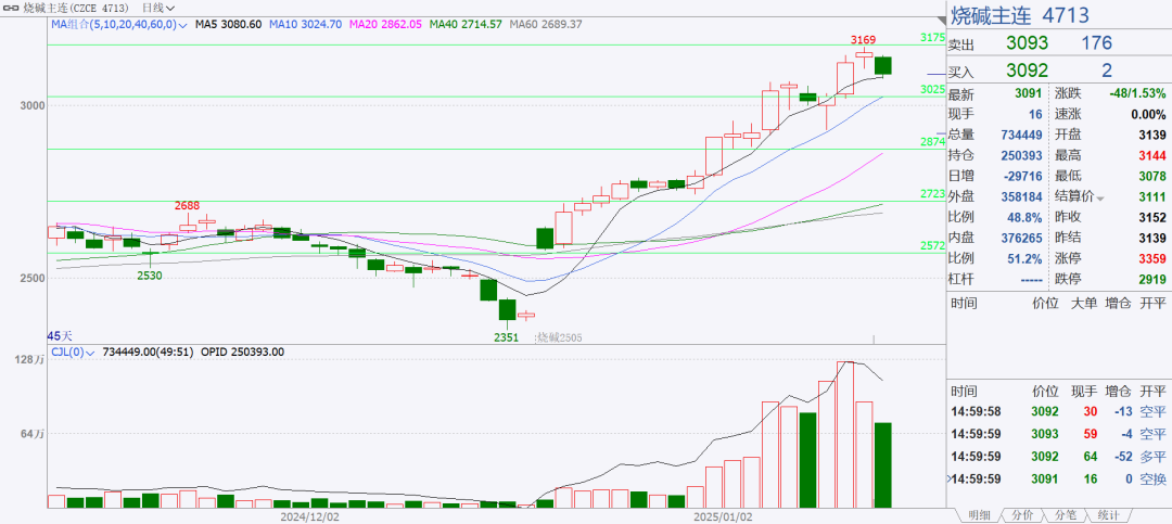 期货端,烧碱主力合约昨日创下新高后今日走跌,收盘价3091元/吨,下跌48元/吨(-1.53%),最高3144元/吨,最低3078元/吨,日内持仓量减少29716手。