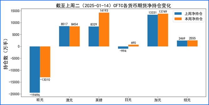 据美国商品期货委员会公布的2025-01-14期货市场头寸持仓报告显示,上周各货币的报告总持仓情况如下:欧元净多头变化6486手,澳元净空头变化63手,英镑净多头变化5864手,日元净多头变化1684手,加元净多头变化418手,纽元净多头变化86手,上周总持仓多空转换的货币有:日元。除此之外,单向总持仓变动超过20%的货币有:英镑。
