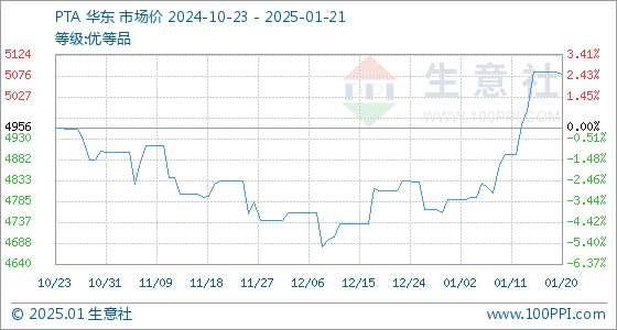 1月21日,生意社PTA基准价为5081.11元/吨,与本月初(4790.00元/吨)相比,上涨了6.08%。