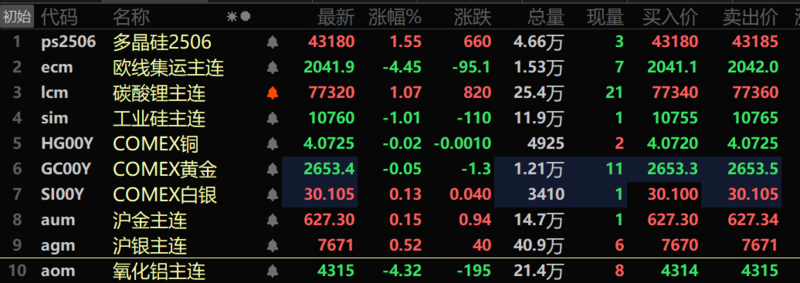 此外,氧化铝跌4.32%。碳酸锂涨1.07%,工业硅跌1.01%。多晶硅期货涨1.55%。