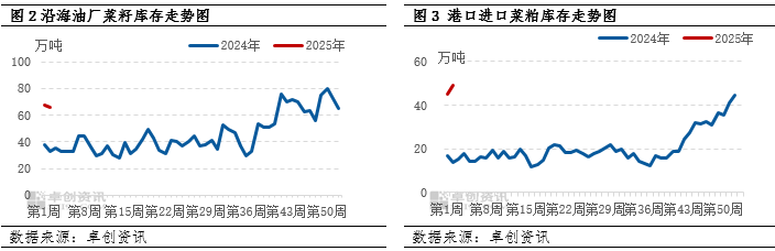 考虑对于加拿大油菜籽反倾销调查事件或影响2025年中国进口加拿大油菜籽的总量以及成本,油厂在9月份起出现买船增加、催发船等情况,另外贸易商增加了对于进口菜粕的购买,包括部分远月订单。反馈在数据方面便是油厂进口油菜籽库存、港口进口菜粕库存双增。卓创资讯最新数据显示,截至1月10日,沿海油厂油菜籽原料库存为66.1万吨,维持在高位水平;全国港口进口菜粕库存为49.12万吨,为近5年的最高位。
