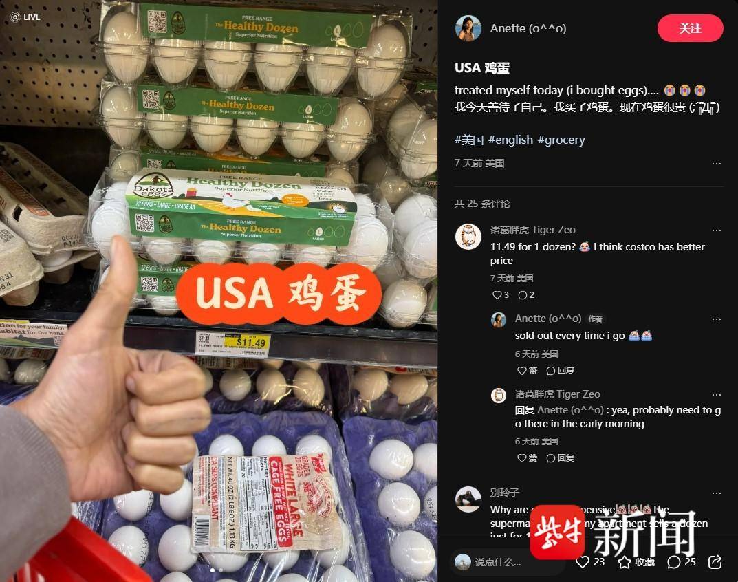 因为传染性极强的禽流感蔓延,导致美国鸡蛋供给不足,蛋价飞涨,连带影响需要大量用蛋的烘焙等行业,消费者四处抢蛋,这种情况可能未来几个月都不会好转。很多美国网友涌入小红书后,第一件事就是学做鸡蛋羹,当他们告诉中国网友一打(12只)鸡蛋需要11.49美元时,让中国网友大感惊讶,也成为中美网友对账的一个话题。