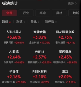 盘面上热点集中在科技股方向,人形机器人、AI眼镜、半导体、电机等板块涨幅居前,除此外大部分题材板块调整为主,教育、光伏设备、服装、油气等板块表现不佳。