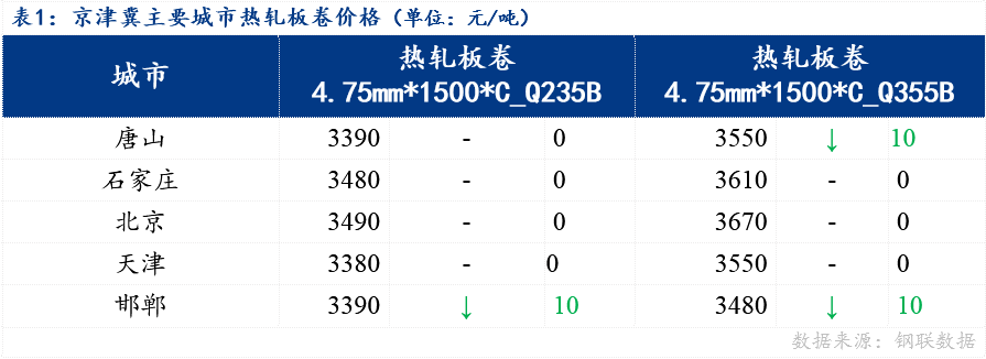 京津冀地区热轧板卷价格稳中下行,其中唐山、天津、石家庄、北京稳;邯郸下跌10元/吨。