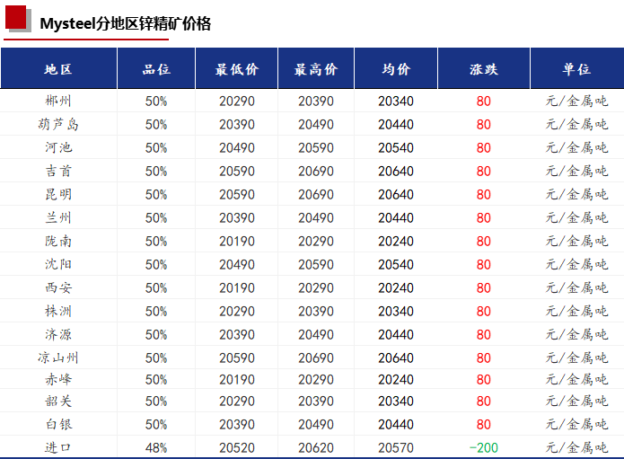 今日受锌价的影响,锌精矿价格上涨80元/金属吨。国内锌精矿加工费各地区均未调整。进口TC目前市场主流报价-35至-15美元/干吨,暂无调整。