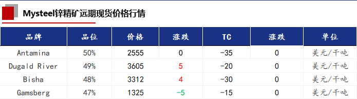华北地区:内蒙古某锌锭生产企业50品位锌精矿加工费2500元/金属吨出厂。