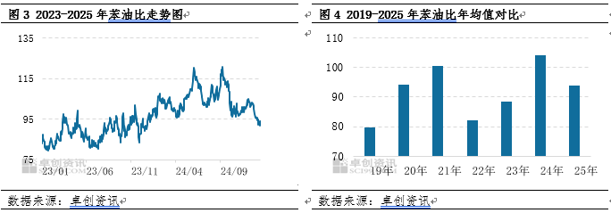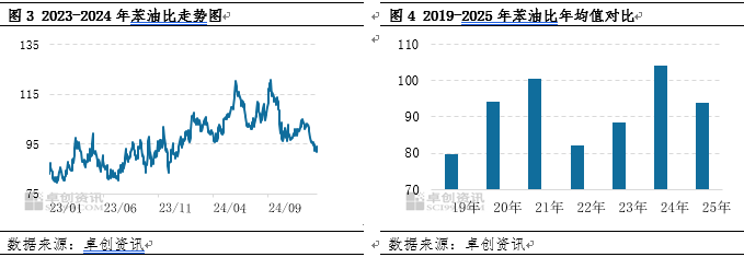 原油作为多数化工品市场的源头产品,对纯苯市场的影响也是至关重要。由于纯苯属于副产品,因此无法从原料角度直接分析利润变化对价格的影响。因此卓创选取苯油比(原油与国内纯苯现货比值)作为分析油价对于纯苯影响的参考指标。从图4近几年苯油比年均值变化来看,2022年以后,伴随国内纯苯下游行业的快速扩张,自身供需面对于纯苯价格的支撑逐渐增强,苯油比年均值呈现逐年递增的状态,并且在2024年达到近年来的峰值,年均值达到104.22。