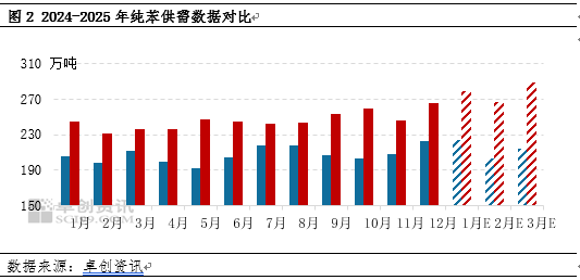 从供需角度来看,1月份纯苯价格低位回弹也受到供需面的利好支撑。1月份预计国内纯苯实际消费量仍保持增长趋势,预计当月纯苯实际消费环比上月增幅5%,叠加春节前部分终端工厂仍存在一定采购需求,对当月价格起到一定利好带动。2月份受春节假期及自然天数减少影响,预计纯苯消费量将出现4.43%的下降,但节后供应量(石油苯国产+加氢苯国产+石油苯进口)预计降幅或将达到8%左右,因此供需面对于节后纯苯市场仍将存在底部支撑作用。