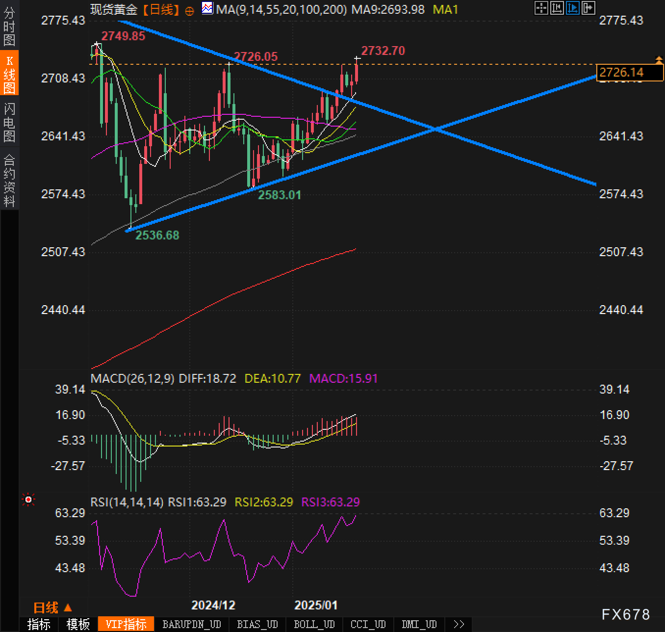 然而,若出现获利回吐,黄金价格可能会回落至2700美元附近,并且以2668美元的水平作为支撑。若价格进一步下行,接下来需要关注55日均线和100日均线的交汇处,约为2646美元,这将是进一步调整的关键支撑位。