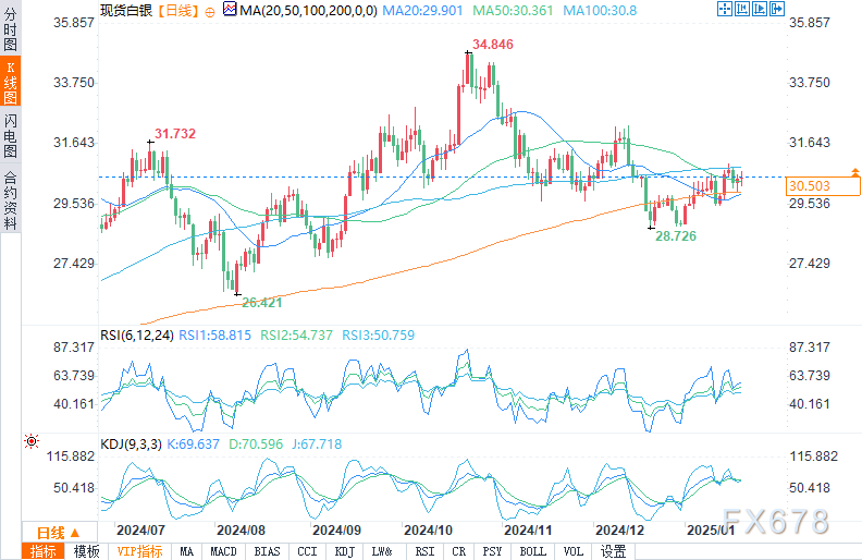 汇通财经APP讯——周二(1月21日)欧盘时段,白银价格小幅上涨,但仍被黄金的表现所掩盖,加征关税的不确定性抑制了上涨势头。白银价格分别高于其50日移动平均线30.90美元和200日移动平均线30.03美元。突破上周的高点30.98美元可能为涨至31.81-32.33美元区间铺平道路。相反,若无法守住200日移动平均线,可能引发下跌趋势。