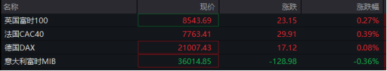 其他市场方面,欧洲股市总体表现平稳,截至发稿,英国富时100指数涨0.27%,法国CAC40指数涨0.39%,德国DAX指数微涨0.08%,意大利富时MIB指数跌0.36%。