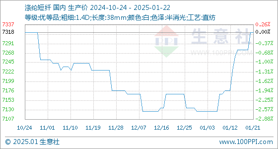 1月22日,生意社涤纶短纤基准价为7318.33元/吨,与本月初(7126.67元/吨)相比,上涨了2.69%。