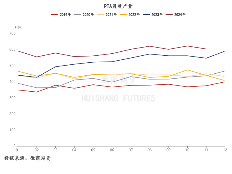 2024年的我国PTA平均开工率为80.54%,较2023年的77.23%有显著提升,主要是受2024年新增产能释放的影响,新装置高开工促使老装置加速淘汰。全年PTA产量约7112万吨,较2023年增长852万吨,增幅约13.61%。目前PTA整体开工率较高,虽不能与19年、20年产能不足时的高开工率相比,但在投产落地的情况下开工已处于较高水平,未来产量增长主要来自于新装置投产。2025年下游聚酯投产增速明显低于PTA,PTA全年累库压力较大,预期PX偏强而PTA偏弱,PTA加工费持续受PX挤压。